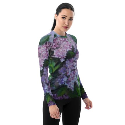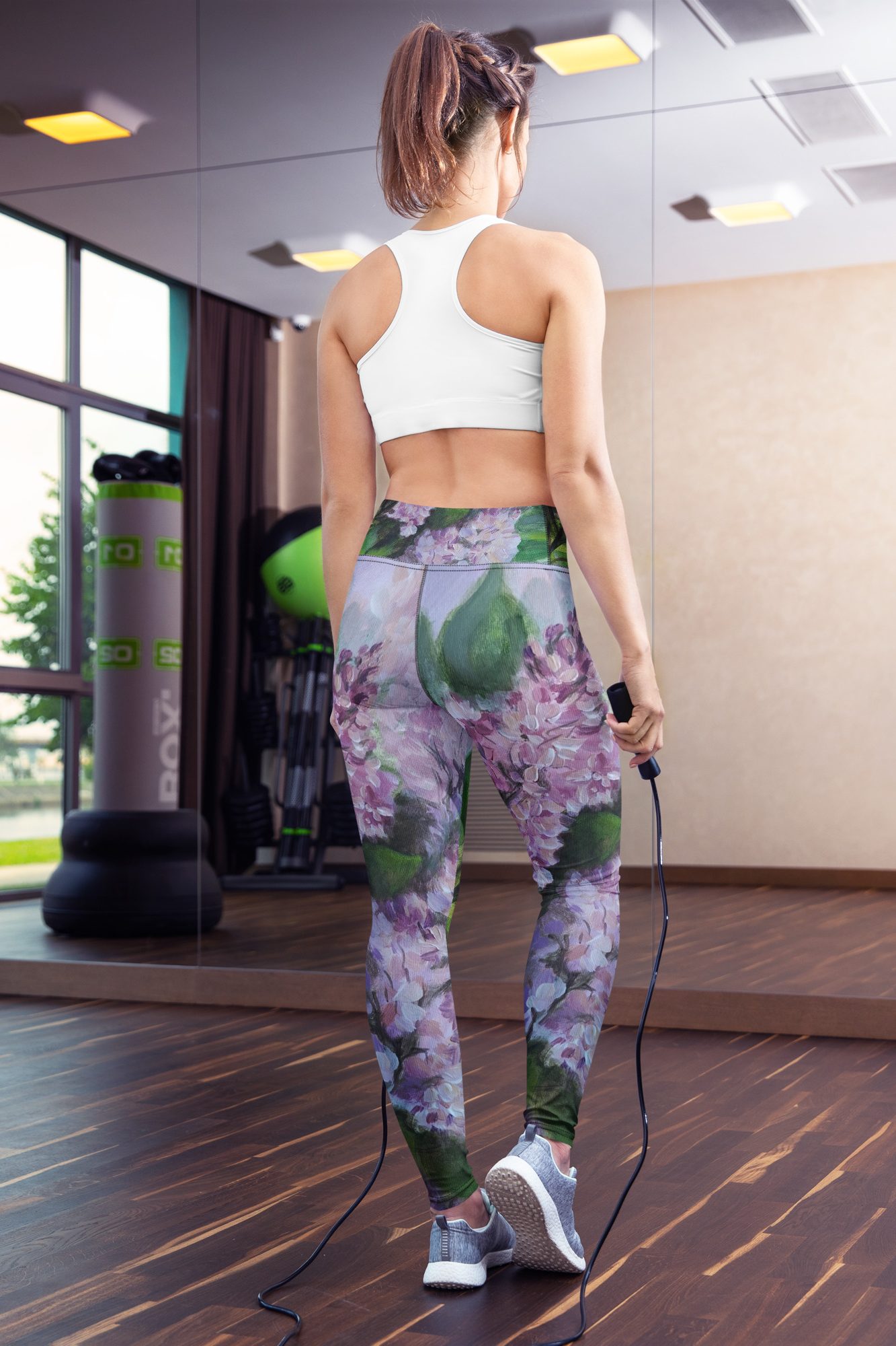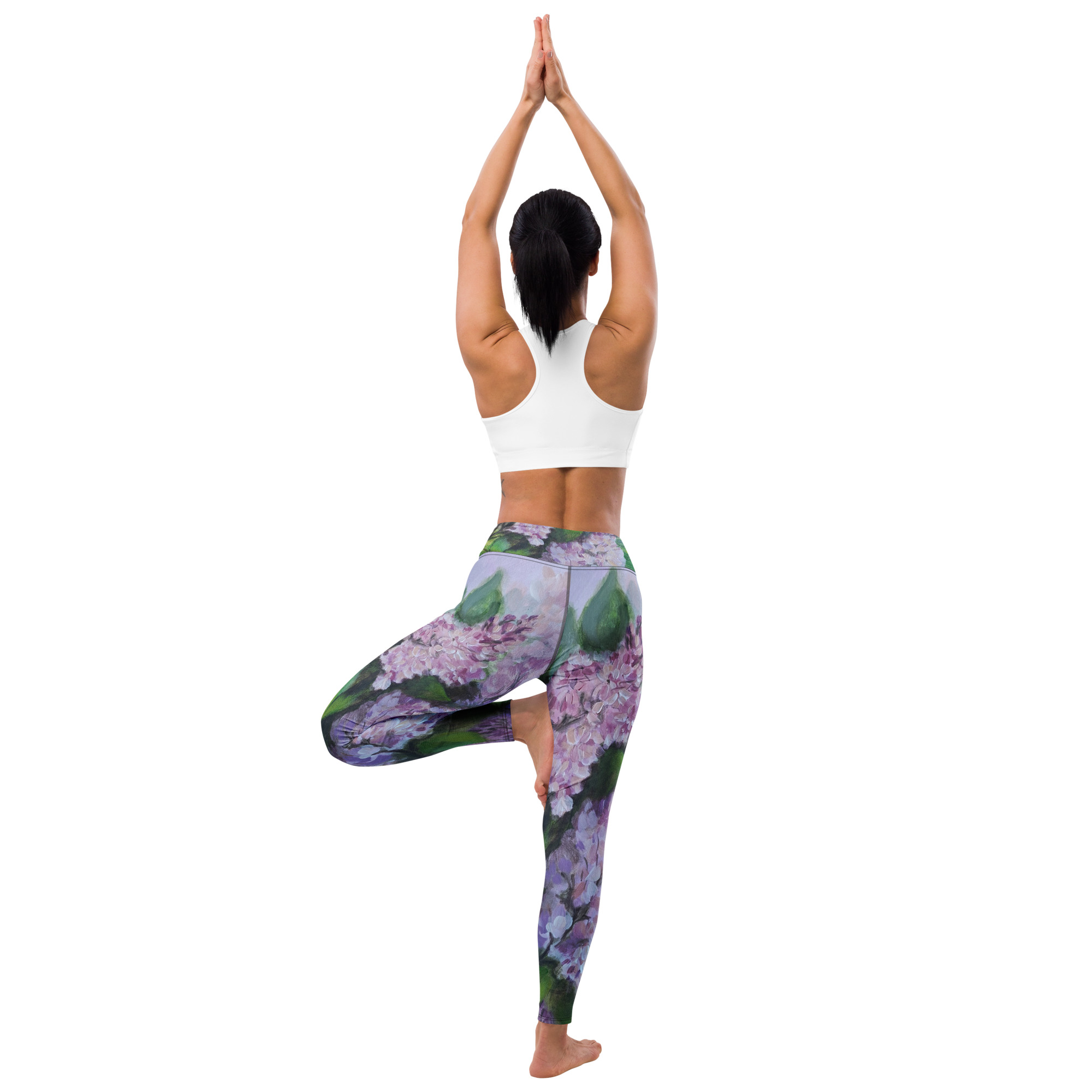 Jogas legingu auduma apdruka tapusi no autores gleznas par ceriņu šķirni “Dobeles sapņotājs”.